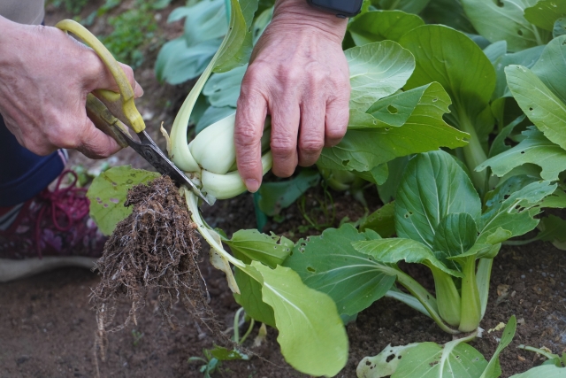 株取りは地際を包丁でカットし、土を持ち込まないよう外葉の泥を落とします。外葉かき取りは、外側から大きくなった葉を数枚ずつ収穫し、中心を残して継続的に収量を確保する方法です。